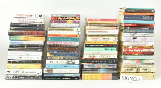Literary fiction, some foreign literature. A collection of signed & unsigned modern first editions and proof copies. Signed titles to include by Tea Obrecht, John Lanchester, Ken Liu, Tom McCarthy, Robert Bolano, Andrew Miller, Tim Willocks, Niccolo Ammanti, Magnus Mills, Junot Diaz, Patrick deWitt, Nicholas Blincoe and others. Unsigned to include Bolano, Patrick McGuinness, Javier Marias, Yann Martel, Andrev Kurkov, and others. Publisher's boards in dust wrappers with Mylar protective covers / wraps, minor shelfwear, else excellent. Approx. forty-six signed titles, twenty-one unsigned. 8vo. (3 boxes)