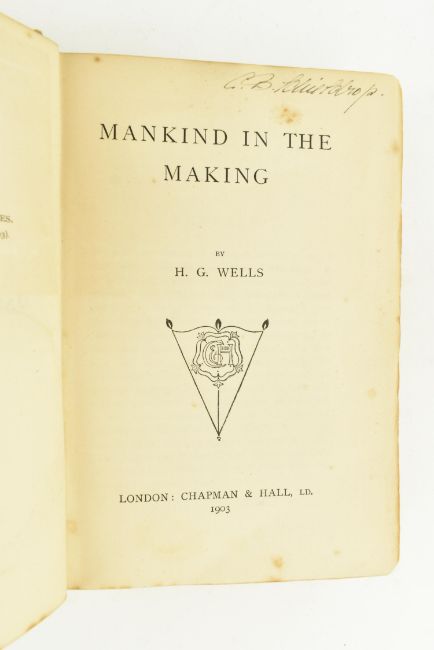 Wells, Herbert George. 1903 Mankind in the Making. London: Chapman & Hall, Ld. First edition, first impression. Publisher's cloth, rather shaken & worn, bend damage to lower corner of front board, extremities rubbed and bumped, spine discoloured & worn to head and tail, lacking ffep, pencil inscriptions to pastedown & front blank regarding selective breeding & eugenics, remnants of a newspaper article to half title, contemp. ownership inscription to title page. 8vo. (1)