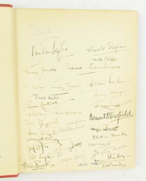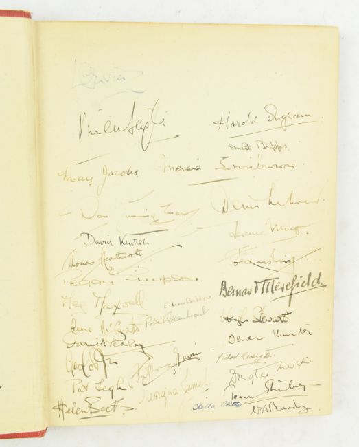Theatrical interest. 1949 The School for Scandal by Richard Brinsley Sheridan. With an Introduction by Sir Laurence Olivier, and designs for decor & costumes by Cecil Beaton. London: The Folio Society. Presentation copy from the cast of the 1949 New Theatre to George (actor George Relph), with thirty-two signatures from the cast including Laurence Olivier, Vivien Leigh, Peter Cushing, Mercia Swinburne (wife of Relph), Terence Morgan, Harold Ingram, Ernest Phipps and others; with dedication for Relph's birthday, 27th January 1949 to front pastedown. The cast later toured Australia with the production. Publisher's cloth, minor wear to the extremities, joints, and head and tail of the spine, lacking dust wrapper, minor age-toning to edges. A remarkable presentation copy from the cast of The School for Scandal, led by Olivier and Leigh and presented to their good friend George Relph. 8vo. (1)