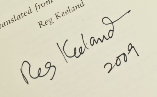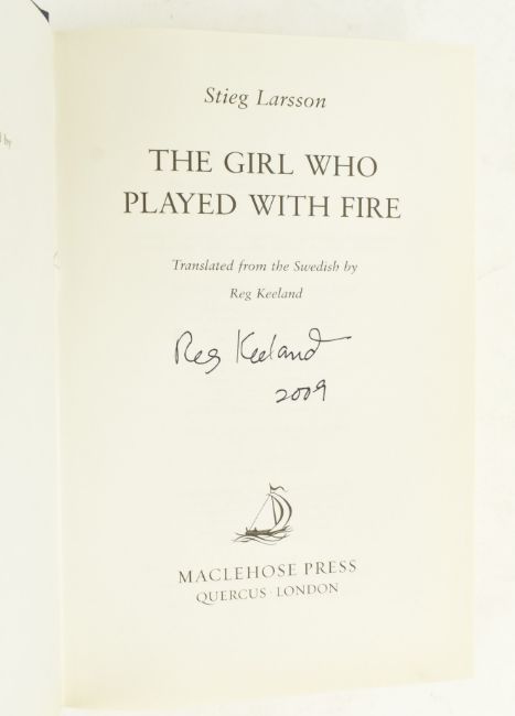 Larsson, Stieg. A collection of six first UK editions, some signed by Reg Keeland, together with a box set & a signed biographical work by Eva Gabrielsson. London: Maclehose Press. Comprising two copies of 2009 The Girl Who Played with Fire, signed & dated by Reg Keeland (pseud. Steven T. Murray) with his business card loosely inserted; two unsigned copies of 2009 The Girl Who Kicked the Hornet's Nest (one bumped to upper corner of spine), 2015 The Girl in the Spider's Web by David Lagercrantz continuing the Millenium series, Waterstones special edition with yellow edges, and a signed numbered limited edition, this No. 474 of 1000; 2011, There Are Things I Want you to Know About Stieg Larsson and Me by Eva Gabrielsson, signed; and 2010 boxed set of the Millenium trilogy in slipcase, with gilt dragon tattoo to boards & case, complete with poster. An excellent collection of Larsson's renowned Millenium Trilogy, the first of which was adapted to film in 2011 starring Daniel Craig & Rooney Mara. 8vo. (8)