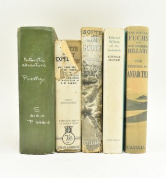 Polar exploration. Five works relating to Falcon Scott & Antarctic exploration from the library of Joseph Hubert Priestley. Comprising Antarctic Adventure - Scott's Northern Party by Raymond E. Priestley (brother of Joseph Hubert), Bell & Cockburn: Toronto ed ex Victoria Public Library rebound in buckram, worn with spine near loose from textblock; 1933 Scott's Last Expedition - the Journals of Captain Scott, sixth imp. cheap impression in decorative cloth & partial dust wrapper (significant loss to dust wrapper); South With Scott by Edward Evans illus. Herbert Ponting, first ed in dust wrapper with losses; 1959 Edward Wilson of the Antarctic by George Seaver, 26th imp in clipped dust wrapper; and 1958 The Crossing of Antarctica by Sir Vivian Fuchs and Sir Edmund Hillary in clipped dust wrapper (foxed and sunned). A good collection. 8vo. (5)