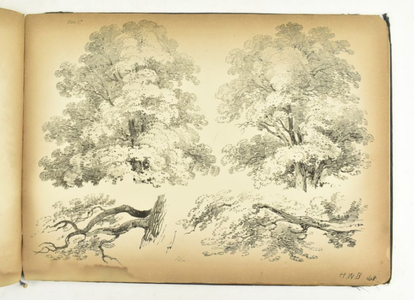 Dendrological interest:- Burgess, H. W. 1837 Studies of Trees, by the Author of the Eidodendron. London: J. Dickinson. Illustrated with lithograph reproductions depicting various trees. Publisher's cloth, spine significantly loosening, bumping to extremities resulting in losses, ex library with stamps & library plate to ffep & front pastedown, internally binding loosening, leaves age-toned and a little edgeworn, some handling marks to plates. A charming early 19th century illustrated work on trees. Oblong folio. (1)