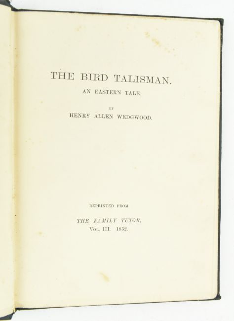 Wedgwood, Henry Allen. 1887 The Bird Talisman, an Eastern Tale. Reprinted from The Family Tutor, Vol. III 1852, by the author's sister, Emma Darwin, wife and cousin of Charles Darwin & granddaughter of Josiah Wedgwood. Publisher's cloth, gilt titles to spine & front board, extremities a touch bumped as are the head and tail of the spine, a few marks incl. damp stain to rear board, pencil inscription 'Mr. Wedgwood gave it to O & me, Everett' to verso of half title; occasional spot internally. Illustrated with engravings throughout. An exceptionally scarce 19th century edition of this children's novel, which was privately printed by the Darwin & Wedgwood families; later it was illustrated by Gwen Raverat and printed in a public run. 8vo. (1)