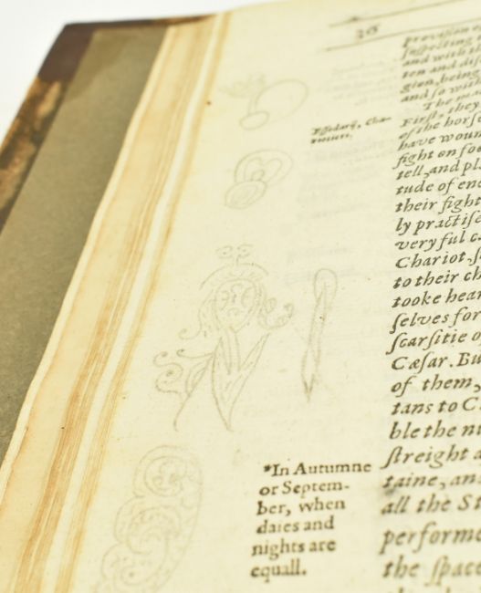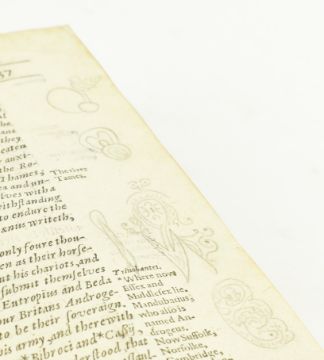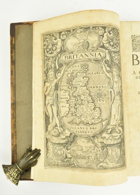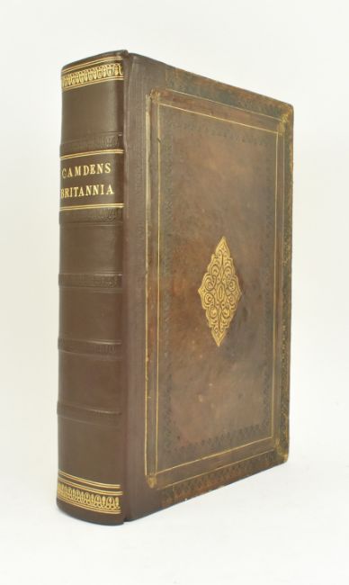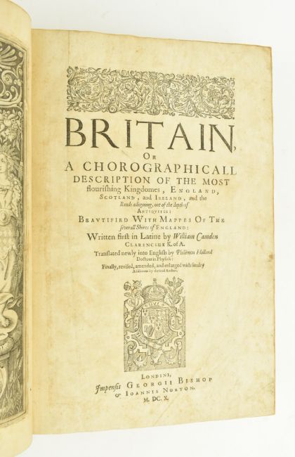 Antiquarian:- Camden, William. 1610 Britain, or a Chorographicall Description of the most Flourishing Kingdomes, England, Scotland and Ireland, and the Ilands adjoyning, out of the depth of Antiquitie: beautified with Mappes of the several Shires of England: written first in Latine by William Camden Clarenceux K. of A. Translated newly into English by Philemon Holland, Docteur in Physick: finally, revised, amended, and enlarged with sundry Additions by the said Author. London: Impensis Georgii Bishop & Ioannis Norton. Lacking maps, complete with engraved frontispiece of Britannia, engraved Coines of the Romanes, headpieces, initials & tailpieces throughout, with the occasional vignette, p36 with charming contemp. pencil doodles. Contemp. calf boads smartly rebacked, blind and gilt tooled borders & central decorative gilt cartouche, minor bumping to extremities, armorial bookplate of Adam Sim Coulter to front pastedown, just the odd spot. Although lacking the Saxton & Kip maps as common, a most lovely example of this important topographical description of British counties, this the first edition in English. Folio. (1)