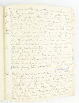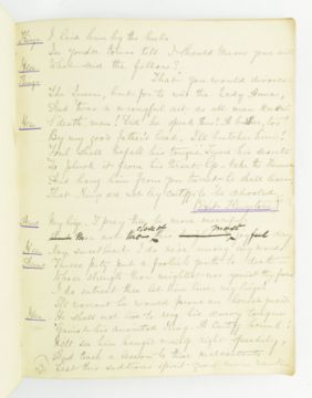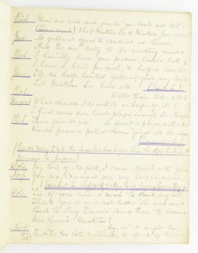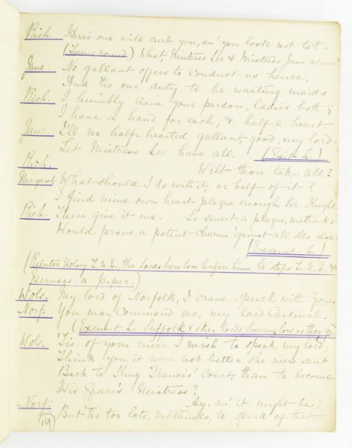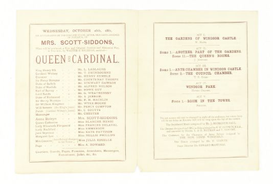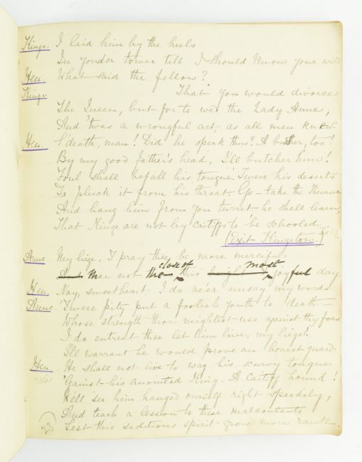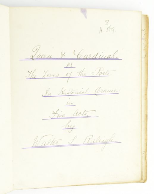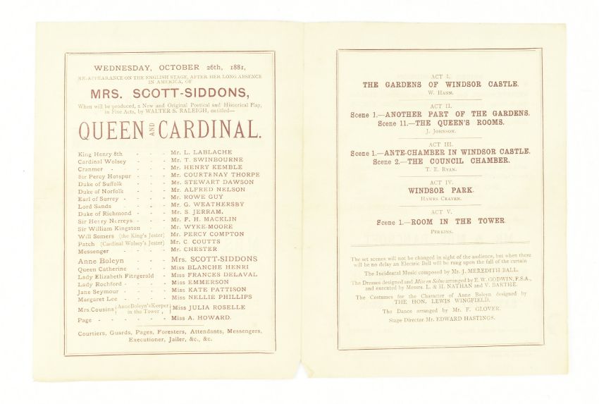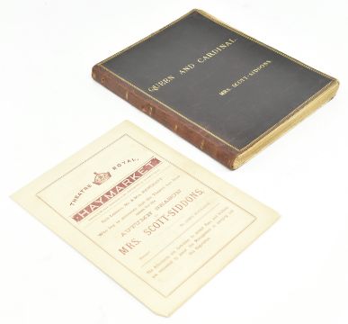 Theatre. 1881 Queen and Cardinal, or, The Loves of the Poets. An Historical Drama in Five Acts by Walter S. Raleigh. Manuscript play script in the hand of Mary Frances Scott-Siddons during her stint at the Theatre Royal, Haymarket under the lessees Sir Squire & Effie Bancroft. Hand written play text throughout in black ink, with purple underline; some pencil inscriptions, stage directions, amendments, additions and annotations throughout ('Lime light on, green mediums', 'Anne smiles triumphantly'), majority appearing in Scott-Siddons' hand, with others. Scott-Siddons performs as Anne Boleyn in the play, with Henry VIII performed by Mr. L. Lablache, Cardinal Wolsey by Mr. T. Swinbourne, Cranmer by Mr. Henry Kemple, and othe actors including Mr. G. Weathersby, Mr. Percy Compton, and Mr. Courtenay Thorpe. Soft full morocco binding, gilt edges, gilt title & Mrs. Scott-Siddons to front board, rubbing to spine, extremities and hinges, and scratches to boards, two small holes to spine, binding rather loose and strained commensurate with use, with some pages loose. A playbill for the work is loosely inserted, advertising Mrs. Scott Siddons' residency for the Autumn season at the theatre, with cast list & acts in order. Music by J. Meredith Hall; dresses and mise en scene by Edward William Godwin F.S.A., costumes for Anne Boleyn by Hon. Lewis Wingfield, choreograph by Mr. F. Glover & stage director Mr. Edward Hastings. An uncommon late Victorian hand written play script by the great granddaughter of actress Sarah Siddons, clearly extensively used during the play's run at the Theatre Royal Haymarket. 8vo. (1)