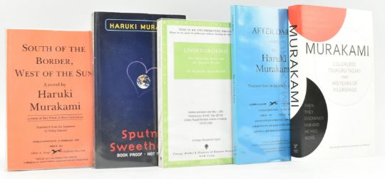 Murakami, Haruki. Five uncorrected advance book proof copies, translated by Philip Gabriel & Jay Rubin. Comprising 2001 Sputnik Sweetheart publ. Harvill Secker; 2014 Colorless Tsukuru Tazaki and his Years of Pilgrimage; 2001 Underground publ. Vintage; 2007 After Dark, a Novel publ. Alfred. A. Knopf; and 1999 South of the Border, West of the Sun, a Novel, publ. Alfred A. Knopf. Publisher's paper wraps, four in protective covers, very light shelfwear else fine. 8vo. (5)