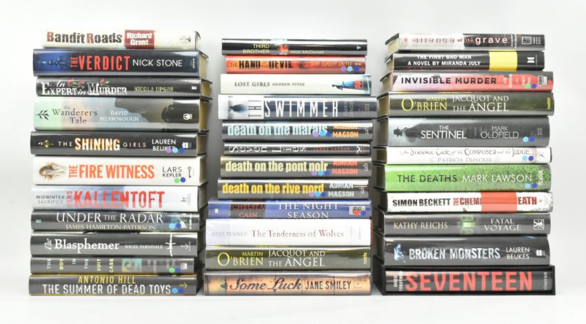 Crime & thrillers. A collection of signed modern first editions. To include titles by authors such as Mons Kallentoft, Martin O'Brien, Nick Stone, Stef Penney, Jane Smiley, Adrian Magson, Antonio Hill, Nigel Farndale, David Bilsborough, Richard Grant, Nick McDonnell, Dean Vincent Carter, Simon Beckett, Kathy Reichs, Lauren Beukes, Mark Oldfield, Hideo Yokoyama, Mark Lawson and others. Publisher's boards in dust wrappers with Mylar protective covers, some minor shelfwear and bumping, an excellent collection. Approx. thirty-four titles. 8vo. (2 boxes)