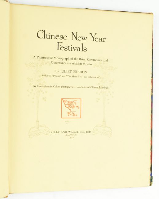 China:- Bredon, Juliet. 1930 Chinese New Year Festivals: A Picturesque Monograph of the Rites, Ceremonies and Observations in relation thereto. Complete with six tipped-in plates in colour-photogravure from Selected Chinese Paintings, each with tissueguard. Shanghai: Kelly and Walsh Limited. Publisher's highly colourful paper covered boards, quarter cloth spine, wear to the head and tail, with joints a little worn, extremities bumped with lower right corner having some loss, edges untrimed, occ. light spotting internally. A beautiful 1930s exploration of Chinese New Year customs. Folio. (1)