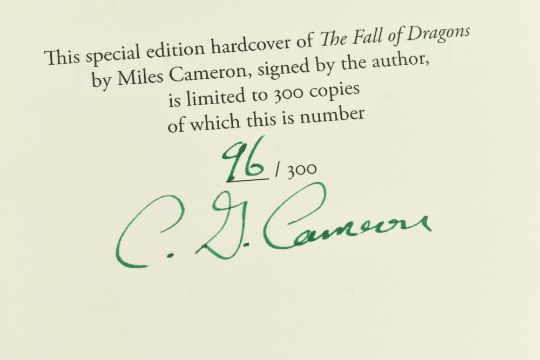 Fantasy:- Cameron, Miles (pseud. Christian Cameron). 2012-2017 The Traitor Son Cycle in five volumes. Comprising 2012 The Red Knight, signed limited first edition being No. 96 of 100, 2014 The Fell Sword, 2015 The Dread Wyrm, 2016 A Plague of Swords, and 2017 The Fall of Dragons. All being signed limited first editions No. 96, latter four of 300. Publisher's boards in unclipped dust wrappers with Mylar protective covers, housed in matched custom slipcases, red example rather rubbed & dusty, resulting in offset leather to other cases; books themselves fine. 8vo. (5)
