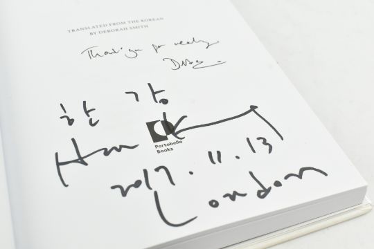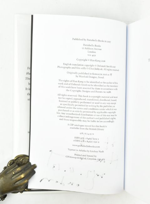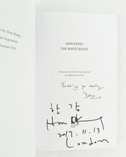 Contemporary South Korean fiction:- Kang, Han. 2017 The White Book. London: Portobello Books. Signed & dated by Kang in characters & English in marker pen, and signed by translator Deborah Smith in biro. Publisher's boards in dust wrapper, fine. 8vo. (1)