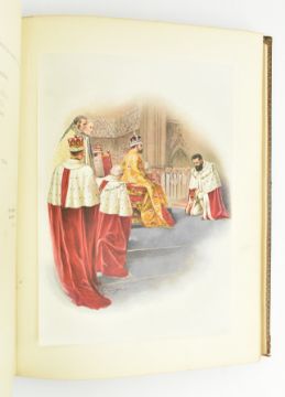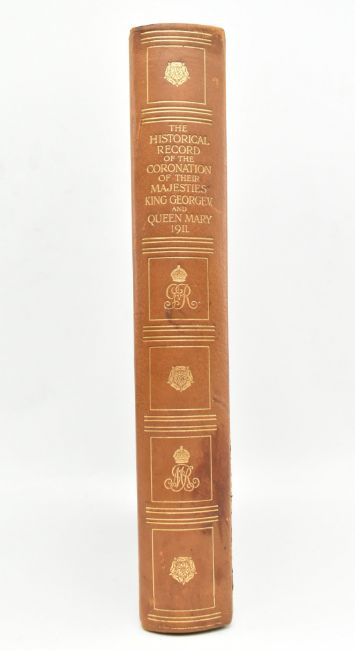 Bindings:- Royal Family interest. 1911 The Historical Record of the Coronation of their Majesties King George the Fifth and Queen Mary. Prepared with the approval of His Majesty the King by H. Farnham Burke, C.V.O., C.B., Norroy King of Arms. London: McCorquodale & Co. Ltd. Deluxe edition. Publisher's finely bound full crushed morocco, gilt borders, decoration to spine & initials to boards, all edges & dentelles gilt, spine ribbed & extremities similarly, front joint staring to tail, silk endpapers, illustrated with beautiful colour lithograph plates complete with tissueguards. A beautiful souvenir of the 1911 Coronation. Folio. (1)