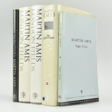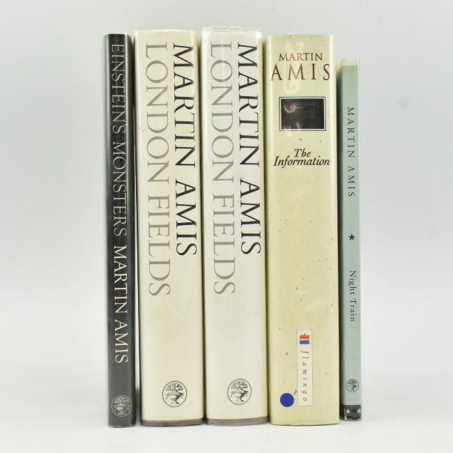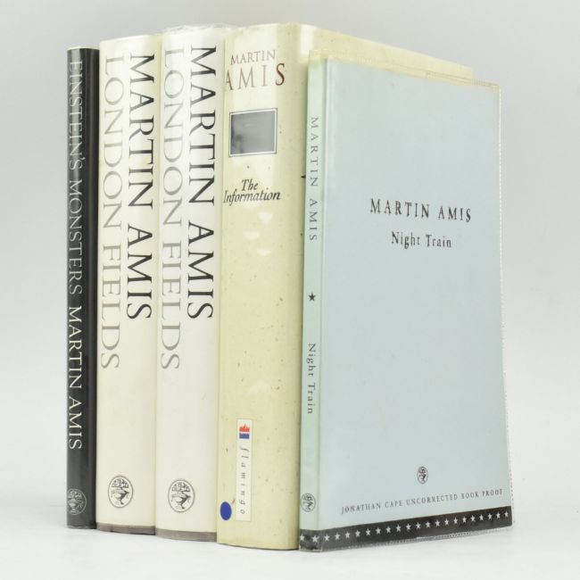 Amis, Martin. 1995 The Information, a Novel. Signed first edition, signed in ink to title page. Together with two copies of 1989 London Fields, 1997 Night Train, uncorrected advance proof copy, and 1987 Einstein's Monsters. Publisher's boards in dust wrappers, one or two price clipped, textblock age-toned, some handling marks, dust & wear, Night Train with text offset. A good collection including a signed first edition. 8vo. (5)