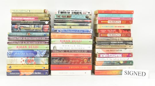 Signed modern first editions. A collection of titles by Anglo / American - Indian authors. Signed titles including A Case of Exploding Mangoes by Mohammed Hanif, In The Kitchen by Monica Ali, River of Smoke by Amitav Ghost, The Inheritance of Loss by Kiran Desai, The World Unseen by Shamim Sarif, The Reluctant Fundamentalist by Moshim Hamid, The Blue Bedspread by Raj Kamal Jha, In The Country of Old Men by Misham Matar. Along with unsigned titles such as The White Tiger by Aravind Adiga, Hullabaloo in the Guava Orchard by Kiran Desai, The Lowland by Jhumpa Lahiri, Difficult Daughters by Manju Kapur, The Blood of Flowers by Anita Amirrezvani, and others. Publisher's orig. bindings, those issued with dust wrappers, minor shelfwear & bumping, else a bright collection. Approx. twenty signed titles, twenty-two unsigned. 8vo. (2 boxes)