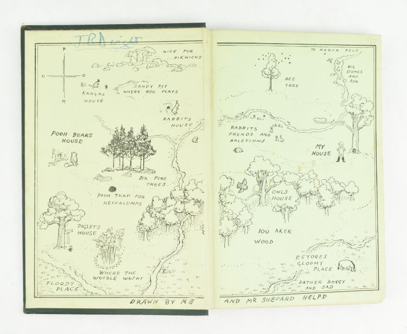 Milne, Alan Alexander. Four first & early edition Winnie the Pooh books. Comprising 1925 When We Were Very Young, tenth edition; 1927 Winnie the Pooh, third edition; 1927 Now We Are Six, first edition; 1928 The House at Pooh Corner, first edition. London: Methuen & Co. Ltd. Decorations by Ernest H. Shepard. Publisher's cloth, gilt pictorial front boards & upper edge gilt; minor bumping to heads & tails of spines and extremities, When We Were Very Young more worn, with central gilt figure to front board having been scratched & worn off; all with neat prior ownership inscr. to front pastedown of J. B. Dwight, ffeps offset as common, just one or two spots, else a smart set including two first editions. 8vo. (4)