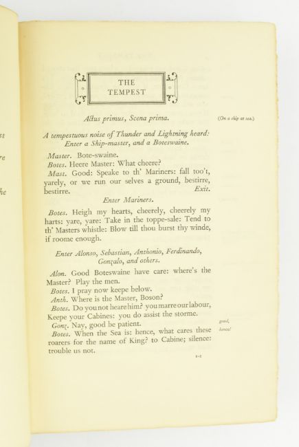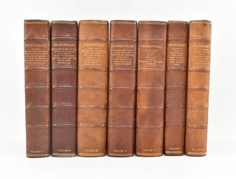 Nonesuch Press:- Shakespeare, William. 1929-33 The Works of Shakespeare - the Text of the First Folio with Quarto variants and a selection of modern readings: edited by Herbert Farjeon. The Nonesuch Press. New York: Random House Inc. One of 1,050, this being No. 1042, designed by Francis Meynell, printed and made by Walter Lewis M.A., bound in London by A. W. Bain. Publisher's full morocco with gilt borders & titles, upper edges gilt, very light rubbing to joints & extremities, spines a trifle discoloured variably, else a beautiful example of this desirable private press printed works of Shakespeare. 8vo. (7vol)