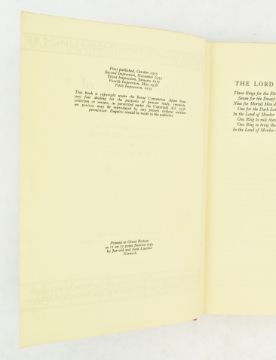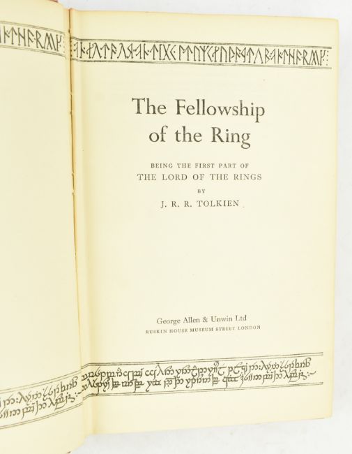 Tolkien, John Ronald Reuel. 1956 The Lord of the Rings trilogy. Comprising The Fellowship of the Ring, The Two Towers, and The Return of the King. London: George Allen & Unwin. First edition, fifth impression. Publisher's orig. cloth, gilt labels to spine, first two volumes with ownership inscriptions in ink to ffep, spines loosening at left joint to first two volumes, later volume brighter & with smarter gilding to spine, extremities bumped, The Two Towers rather cocked, Fellowship similarly, extremities bumped and bruised, some marks to the boards of earlier volumes, in need of sympathetic restoration. Tolkien's monumental fantasy epic trilogy, published following the success of The Hobbit. 8vo. (3vol)