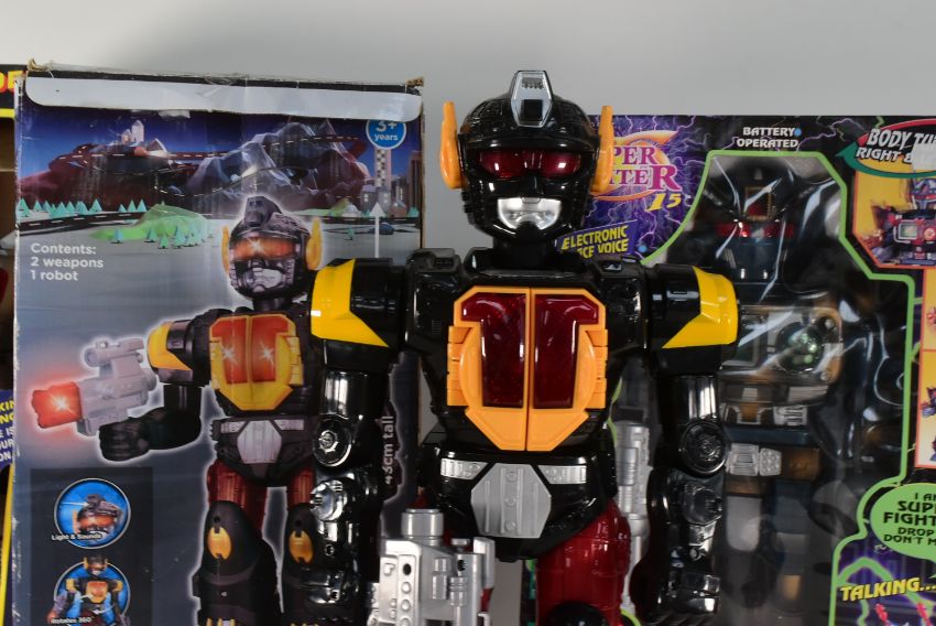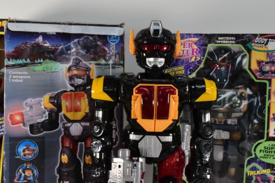 Robots - x3 battery operated robots comprising Super Fighter 15 (Hap-p-kid, Hong Kong), Robot Commander II (China) and Defender Robot (Chad Valley). Untested, with clean battery compartments.