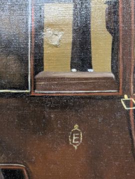 (ARR) John Leigh Pemberton (British, 1911-1997) - Royal Coach - a 20th century oil on canvas painting depicting a coach with crest to door and initial E. Signed with initials to lower left. Framed. Two repairs to canvas.John Leigh-Pemberton was a British illustrator who was commissioned in the 1950s to paint the Royal Coaches, housed at The Royal Mews, in the stables of Buckingham Palace. Measures approx. 51cm x 68cm including frame.