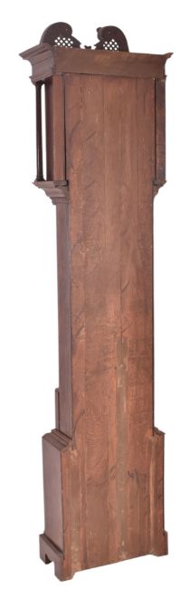 A North Country 19th century George III oak-cased longcase grandfather clock by Skerratt of Astbury. The eight-day clock having a circular brass dial with a Roman numeral chapter ring and faceted hands. All housed within an oak case having a swan neck pediment hood with all raised on bracket feet supports. With two weights. No pendulum present.