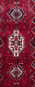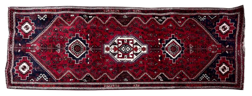 A 20th century South West Persian Islamic Qashqai floor carpet runner rug. The runner having a red and burgundy ground with central geometric panel with three stylised medallions to centre. Further geometric motifs throughout and four panels to corners. Short tassels to ends.