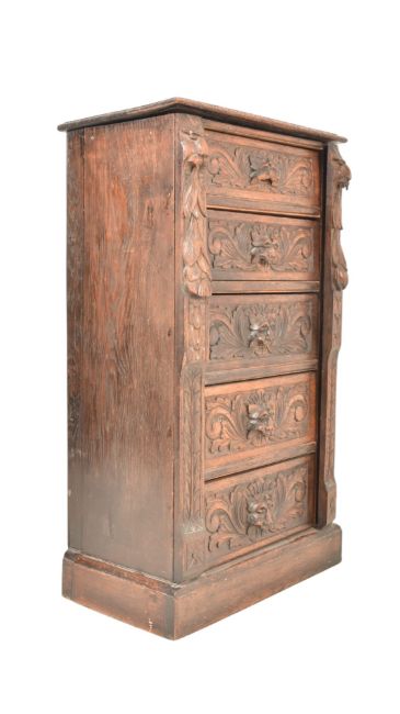 A 19th century Victorian carved oak Wellington chest of drawers. The chest having a flared top over a bank of drawers with Green Man carving embellishments and an upright locking bar. All raised on a plinth base.