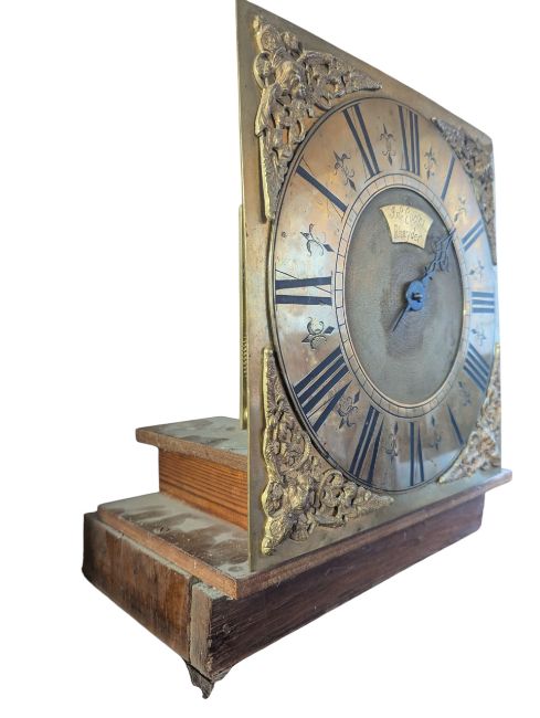 A Welsh 18th century brass-faced and oak cased long case grandfather clock. The clock having a squared hood set with a brass face having Roman numeral chapter ring marked for Jno. Evans, Rhayder. Oak case with all raised on a plinth base.