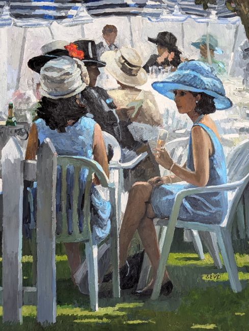 Sherree Valentine-Daines (SEVD) (British, b. 1959) - Ascot Cafe - an oil on board painting of ladies sitting at a table by a tree. Signed lower right corner. Framed. Label for Thompson's Gallery, Cheltenham. Framed.