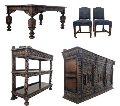 A continental carved oak wood dining suite comprising of table with chairs, buffet and sideboard credenza. The table having a rectangular chamfered carved edge top over a carved fitted frieze and pierced scrolled frets. All raised on exaggerated carved cup & cover supports with squatted feet, together with blue velvet upholstered dining chairs united by peripheral stretchers. The buffet having a carved pierced gallery back with dragons and foliate motifs. Full-length drawer to top with carved Green man to centre over two shelves flanked by figurative caryatids representing possibly kings. The sideboard credenza having a straight gallery back over chamfered edge top with three single handles below. Each drawer flanked by carved lion heads. Three single cupboard doors below each intricately carved with Dutch countryside scenes. Plinth base below.