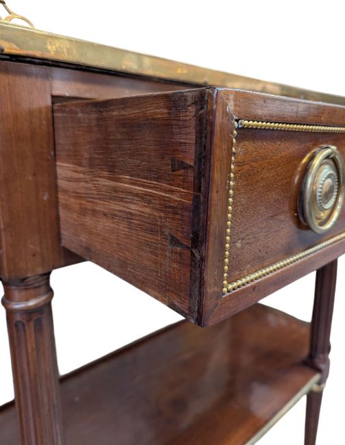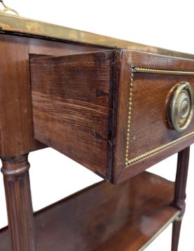 A French Louis XV manner 19th century mahogany and brass mounted console hall table. The table having a brass pierced gallery surround over a marble top. Central twin handled drawer flanked by curved side doors. Raised on reeded tapering supports with undertier. Brass ends.