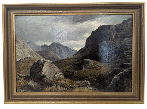 A late 19th / early 20th century oil on canvas Scottish Highland landscape painting. The painting depicting a mountainous landscape with peaks in the background. Signed M W to lower left. Framed.
