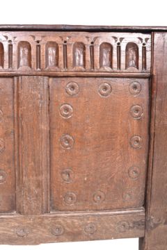 A 17th century carved oak hinged top coffer chest. The chest having a panelled top with wrought iron hoop hinges opening to reveal a spacious interior. The carved front with four fielded panels each having a decorated frame. All raised on stile supports.