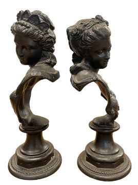 Kasli Foundry - a pair of late 20th century 1980s USSR Russian cast iron busts of ladies. Each sculpture depicting with coiffured hair, raised on beaded socle base. Foundry marks & signatures to base.
