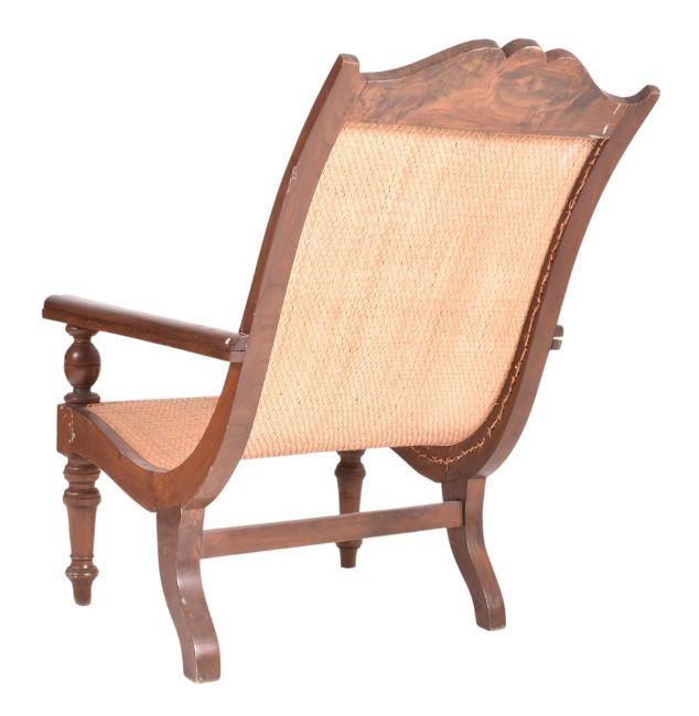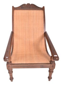 An early 20th century mahogany framed rattan plantation armchair. The lounge chair with woven rattan cane seat, mahogany framed wth extending arms. This over turned wooden supports. Measures approx. 109cm x 70cm x 106cm.