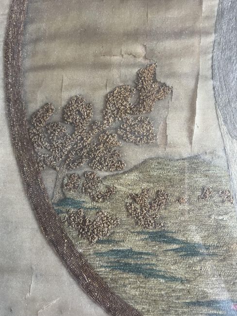 A George III 18th century silk work embroidery figural picture. The panel depicting a figure with a bow and arrows within a naturalistic background. Within an oval embroidered frame. Some damage to silk. Framed & glazed in giltwood & gesso frame.