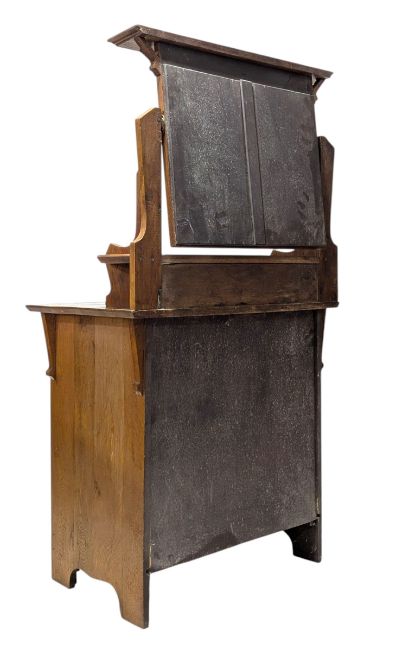 Manner of Shapland & Petter - an Arts & Crafts early 20th century circa 1920s oak wood dressing table chest. The dressing table having an adjustable mirror atop with flared pediment and Ruskin ceramic roundel to frieze. Single top drawer flanked by storage spaces. Bank of three twin handled drawers to base with embossed escutcgheons and drop handles. All raised on bracket feet with shaped apron. Drawers stamped Jesty & Co, Yeovil.