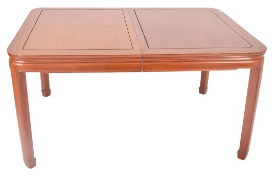 A large 20th century Chinese hardwood extending dining table and twelve matching chairs. The table of large rounded, rectangular form having three extra leaves with all raised on shaped legs. The set of twelve chairs having bar back backrests over padded seats with each raised on saber legs.