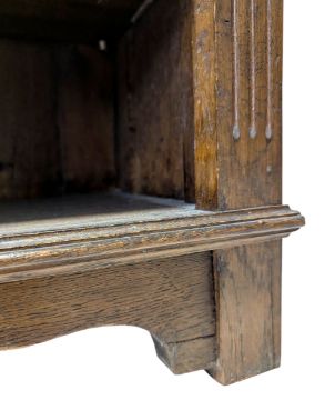 An Arts & Crafts manner of Liberty of London early 20th century circa 1920s oak open window bookcase. The bookcase having a straight flared top with fitted frize below. Series of shelves below flanked by reeded sides. All raised on stile straight supports.