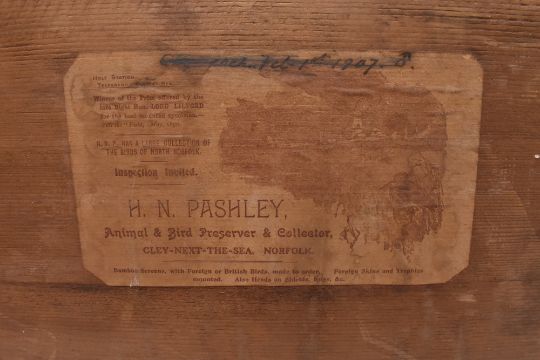 Taxidermy. An early 20th century Edwardian cased taxidermied Arctic Ivory Gull (Pagophila eburnea) by H. N. Pashley, Cley near the Sea, Norfolk. The gull modelled in naturalistic surroundings, presented in contemp. ebonised & glazed case. Label to verso, dated 1907. Lacking glass frontage.