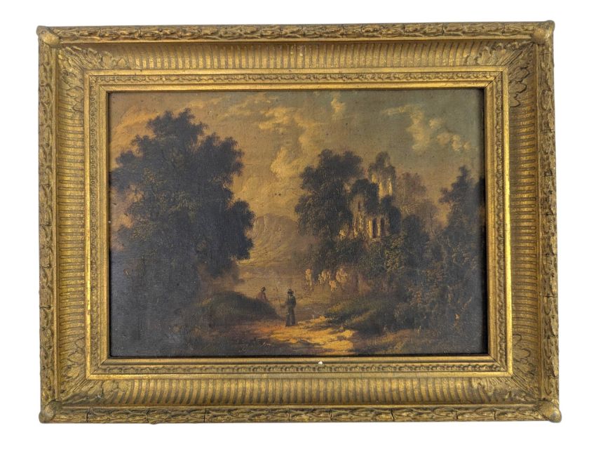 English Romantic School - a pair of 19th century oil on canvas landscape paintings. The lot to include a landscape with ruins in the background and figures in the foreground, together with a similar landscape with bridge and figures. Unsigned. Each framed in giltwood frames.