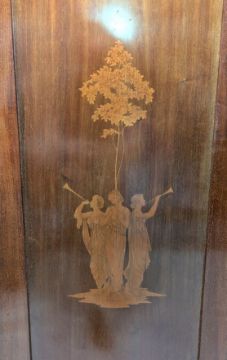 A Continental early 20th century mahogany inlaid armoire wardrobe. The wardrobe inlaid with a Three Graces design to the doors. Pair of drawers to the base with swag inlaid detailing.