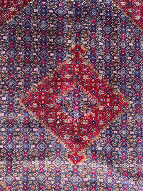 An early 20th century North West Persian Islamic Tabriz floor carpet rug. The carpet having a blue & red ground central panel with intricately woven stylised floral & geometric motifs. Matching series of outer borders with short tassels to ends.