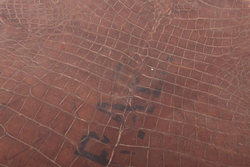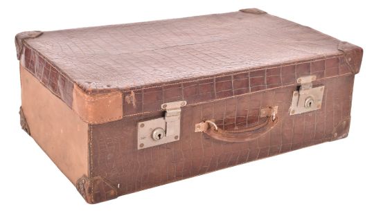 A vintage mid century 1950s crocodile skin travel case / suitcase. The case of typical form having crocodile hide cover with later handle and metal locks. The lid opening to reveal a hollow interior. With the original canvas cover.