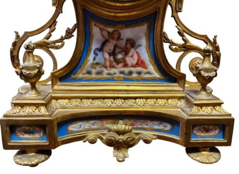 A French Continental 19th century hand painted and gilt & enamel face 8-day mantel clock. The clock having an urn shaped finial atop with laurel swags. Gilt and Roman enamelled numerals to chapter ring. Central hand painted cartouche with cherubs holding astronomy related items. All raised on plinth base. 8-day movement.
