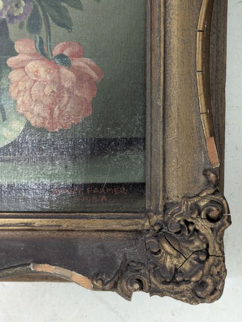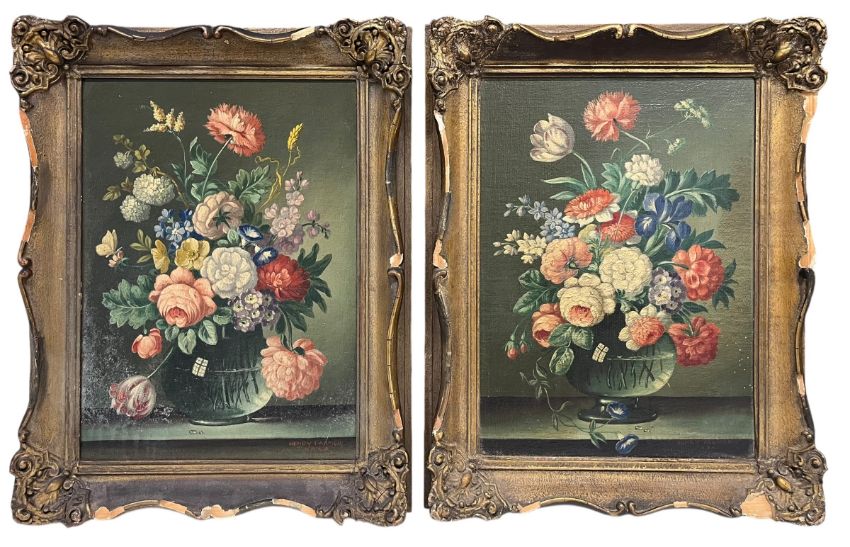 Henry Farmer FRSA (British) - a pair of oil on panel still life paintings. Each depicting still lifes with roses, carnations, chrysanthemums and sweet william in clear glass vases. Each signed in red to lower right. Each framed in giltwood and gesso frames.