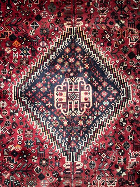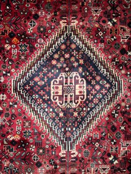 An early 20th century South West Persian Islamic Qashqai floor carpet rug. The rug having a central diamond shaped medallion decorsted with intricate geometric motis. Central red ground panel with further decorations. All enclosed in outer borders with geometric & floral motifs. Short tassels to ends.