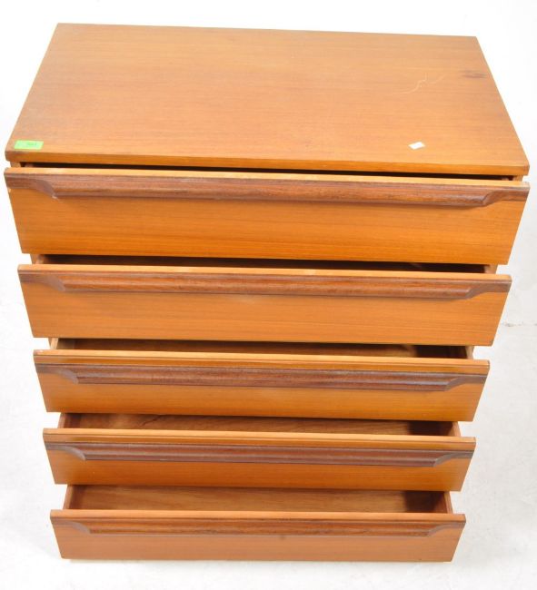 Avalon - Mid century teak chest of drawers. Rectangular form with a bank of five graduating drawers. Supported on a plinth base with lipped pull handles. Measures approx: 79x76x47cm