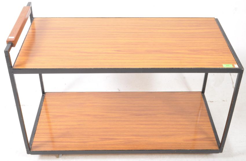 British Modern Design - A vintage mid 20th century Industrial teak style veneer and metal hostess / cocktail serving trolley. The trolley raised on castors, having ebonised metal frame. Featuring two tiers of teak style veneer shelves. Measures approx: 66x96x46cm