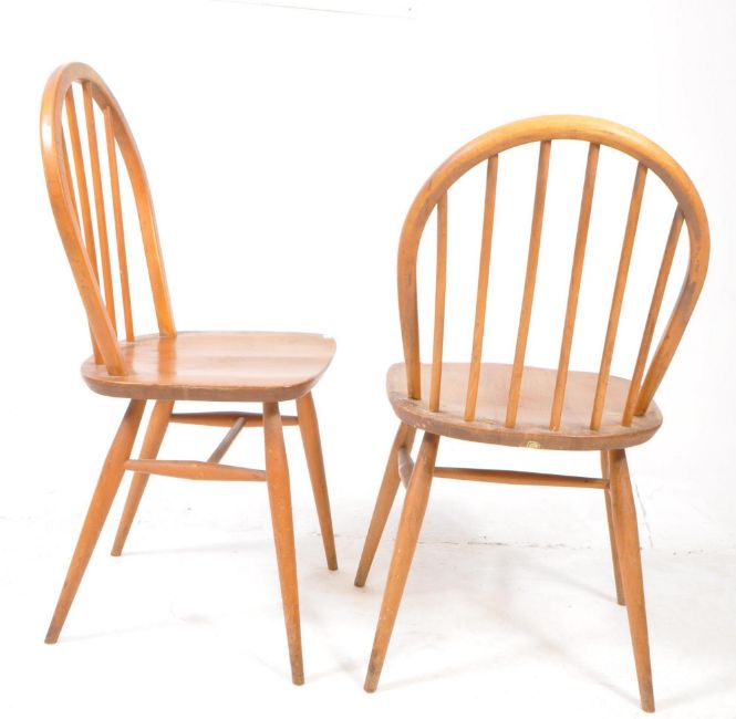 Ercol - A pair of beech mid 20th century dining chairs. Spindle hoop back rest, saddle seat on tapering legs united by h stretcher. Measures approx: 86x39x38cm