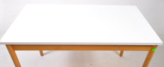 Vico Magestretti for Habitat - A vintage mid 20th century formica and beech wood kitchen dining table. The table raised on rounded beech wood supports, with white formica top above. Measures approx: 74x121x68cm