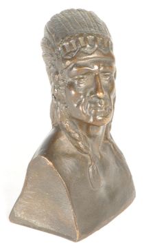 An early 20th century bronze bust / paperweight of a native american. In a feathered headdress with tied shoulder length hair.